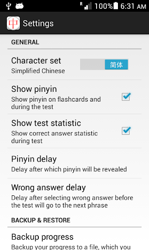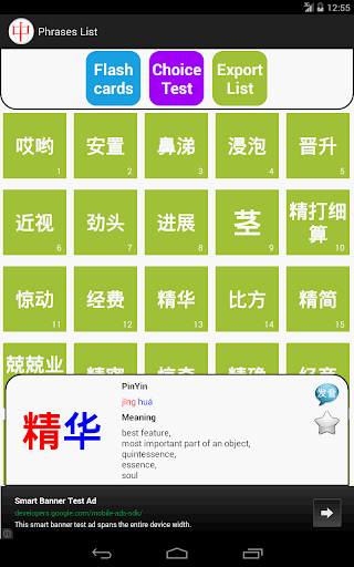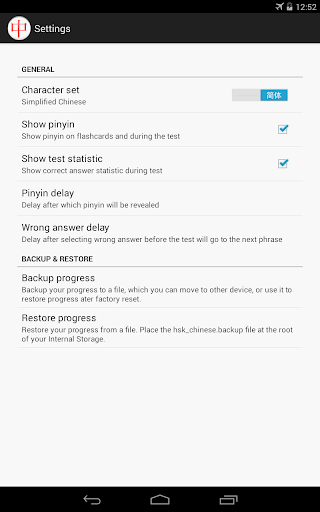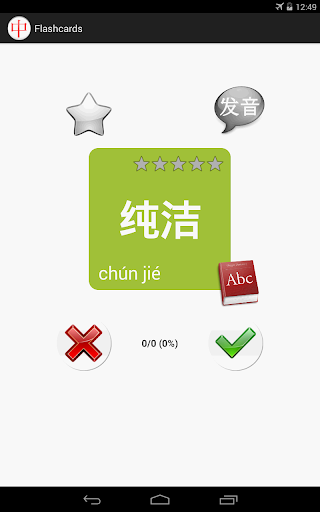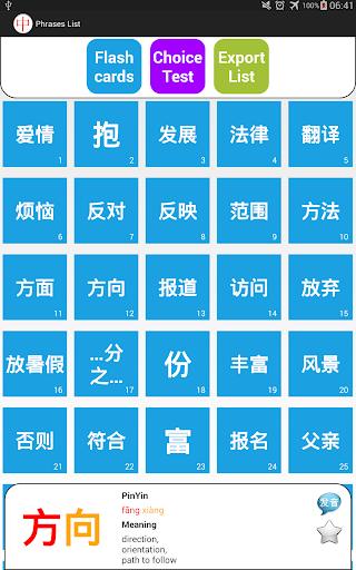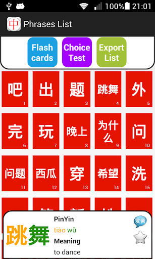 Flashcards veya çoklu cevap testleri kullanarak Çince bilginizi test edebilirsiniz. Dört öğrenme modu vardır: Çince-İngilizce, İngilizce-Chniese, Pinyin, Tonlar.