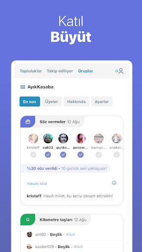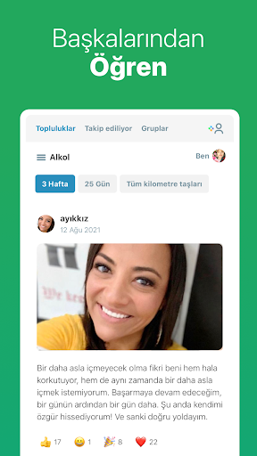 Ayık olduğunuz günleri takip etmenin yanı sıra, yeni alışkanlıklar edinmenize yardımcı olur ve sizi aynı hedef: "her seferinde bir gün daha ayık kalmak" için çabalayan geniş bir insan ağına bağlayarak sürekli motive kalmanızı sağlar.