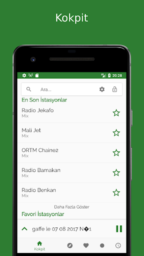 Dinlediğin radyo akışını duraklatabilir ve devam ettirebilirsin. İstasyonun çalınan şarkılar hakkında bilgiler gönderirse, dinlenen tüm şarkılar da gösterilir ve tek tıklamayla kolayca yer imlerine eklenebilir.