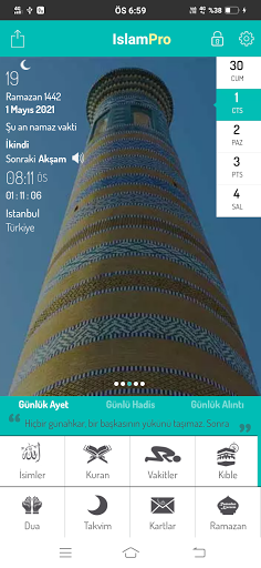 • Önemli İslami günleri liste olarak görüntüleyin, uygulama simgesinde Hicri tarih, Geçerli gün için Ay evresi!