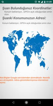 Uygulama bulunduğunuz yerin koordinatını ve adresini size gösterir. Adres bilgisi Google servislerinden alınmaktadır bundan dolayı adres gösterimi için internetinizin açık olması gerekmektedir. Uygulama hiçbir şekilde bulunduğunuz yerin koordinatını ve adresine kaydetmez. Yalnızca ekranda size gösterir. Adres