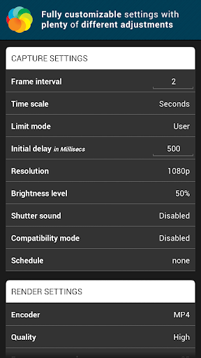 Lapse It is the ONLY app on Google Play with this powerful render engine, and the only one that really works rendering the videos in the Android proper format, so you can easily watch the videos on your phone, share it across the web and with other devices.