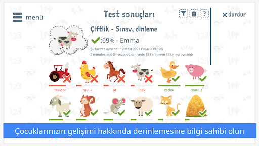 Çocuklarınızın dinleme ve okuma becerileri uygulama tarafından ölçülür; ebeveyn veya denetmen tarafından görülebilir. Sonuçlar sınırlı bir zaman için görüntülenebilir. Abonelik ile son iki haftanın sonuçlarını görebilirsiniz; temalara ve becerilere göre filtreleyebilirsiniz.