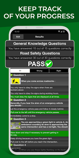 Resmi RTA testi ile aynı koşullar altında bir simülasyon gerçekleştirin. Sınav öğrenicisini geçmek için, 15 genel bilgi sorusu arasında en az 12 dkt soruyu ve 30 yol güvenliği sorusu arasında en az 29'u doğru bir şekilde cevap vermesi gerekir.