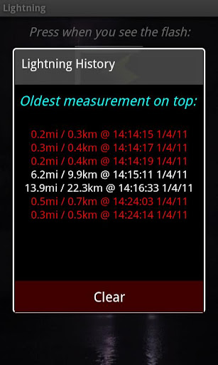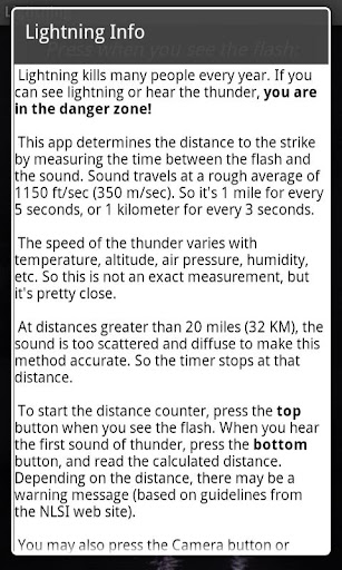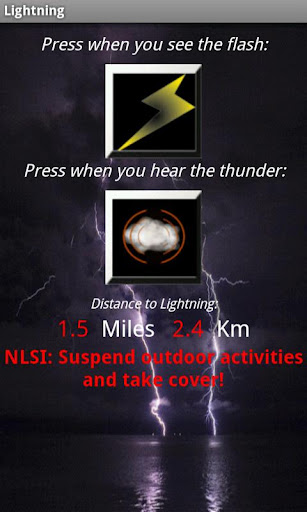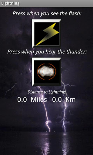 The original Android Lightning distance calculator. Press the top button when you see the flash, press the bottom one when you hear the thunder. The distance is shown in Miles and KM, up to 20 Miles. If you like, you can also start and stop the timer with the Camera button, trackball, or D-Pad.