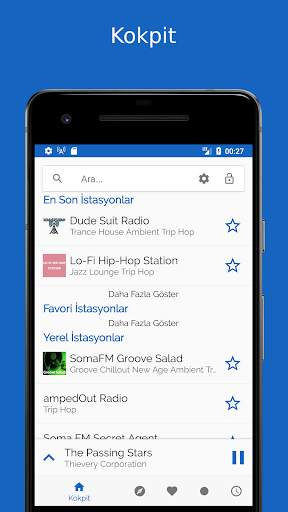 Dinlediğin radyo akışını duraklatabilir ve devam ettirebilirsin. İstasyonun çalınan şarkılar hakkında bilgiler gönderirse, dinlenen tüm şarkılar da gösterilir ve tek tıklamayla kolayca yer imlerine eklenebilir.