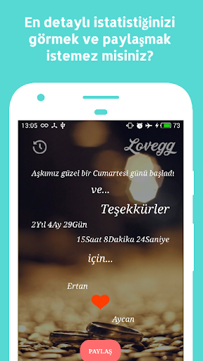 Başlangıçta girmiş olduğunuz tanışma tarihinden itibaren geçen süreyi size sunmaktayız. Kaç gündür birlikte olduğunun yanı sıra İstatistik bölümünde daha fazla detay bulabilirsiniz.