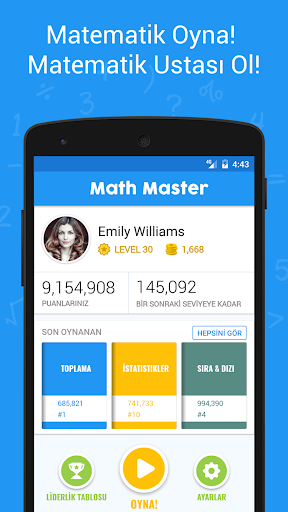 Öğrenci misiniz ve sınavlardan daha yüksek not almayı garanti altına almak için matematiksel yeteneklerinizi geliştirmek mi istiyorsunuz? Çocuklarınız için havalı bir matematik soruları oyunu mu istiyorsunuz? Yada bir matematik uzmanısınız ve akıl egzersizleri ile günlük matematiğinizi mi geliştirmek istiyorsunuz? O zaman doğru yere geldiniz. Math Master tüm yaş grupları için tasarlanmış ücretsiz bir matematik soru oyunudur! Tüm matematiksel ve aritmetik işlemler için size bir dizi zorlu sınav sunmaktadır. İstediğiniz bir kitabı seçin, oynamaya başlayın ve oyun profilinize seviye atlatın. Matematik problemlerini çözün ve bir Math Master olun!