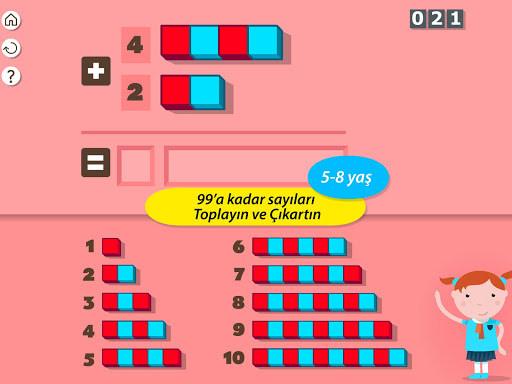 5 ila 8 yaş arası çocuklar için, tamamıyla dört işleme adanmış tek uygulama! Toplama, çıkarma, iki kat yarısı, tek ve çift sayılar !