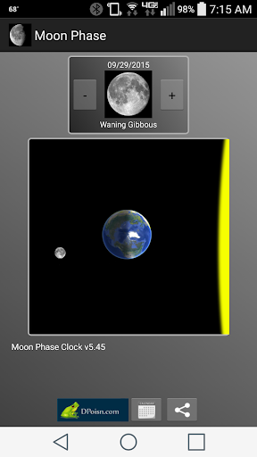 Yeni: Sadece ayın yeni 1x1 widget'ı eklendi. Ayrıca, widget'ları desteklemeyen cihazlar için başlatıcı simgesi eklendi. Bilgi ekranı için widget'ı tıklayın. Bu, günlerde kaydırmanıza olanak sağlar ve Dünya ile ilgili olarak ayın bir grafiğini gösterir. Ayın neden herhangi bir zamanda yaptığı gibi göründüğünün daha iyi bir gösterimini sunar. Dünyanın rotasyonu bir saat içinde doğrudur.