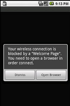 Online for Real alerts you when your connection to the internet is blocked by a "welcome page" of a hotel, airport, coffee shop...