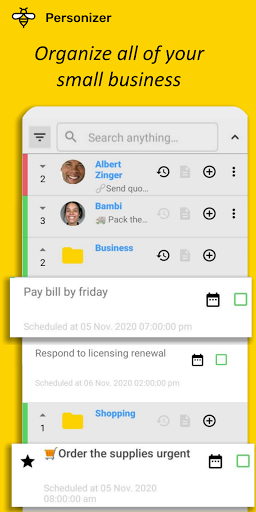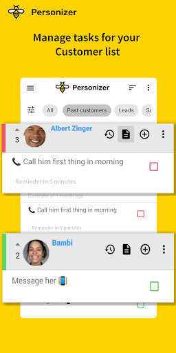 Personizer, Todo / Job Manager, Müşteri Notları, CRM aracını değiştirir ve mevcut kişileriniz ve takviminizle birlikte, küçük bir işletme organizatörü kullanımı basit bir şekilde entegredir. Dolayısıyla müşteri ilişkileri hiç bu kadar kolay olmamıştı.