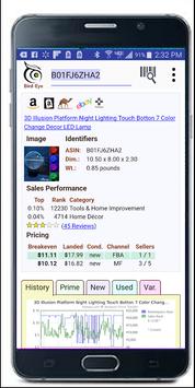 Pojava Bird-Eye enables you to scan a product's barcode (or search by name, or do a voice search, or search by ASIN) and see detailed results on the history and profitability of the product.