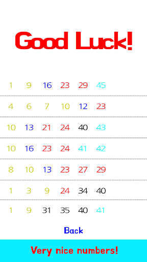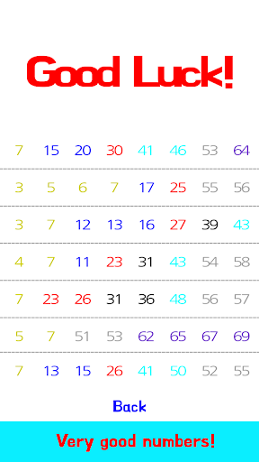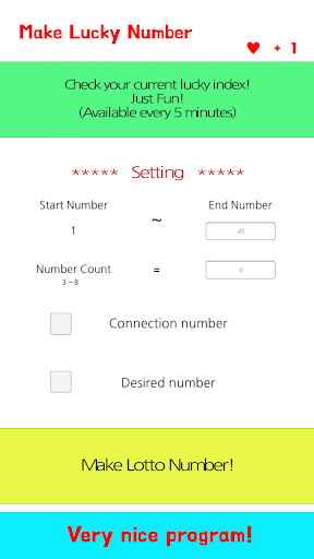 This app is a great way to make lucky numbers. This app gives you fun to see your current luck index. This can be useful for creating a "PowerBall" or "Lotto" number. Please use before it is late!