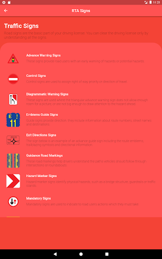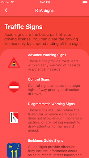RTA Sinyal Testi اشارات السير App size pratik testinizi geçmeyi anlamak için ihtiyacınız olan tüm trafik işaretlerini sunar. Tüm trafik işaretlerini öğrenebilirsiniz. Her işaretin ayrıntılı bir açıklaması var. Trafik işaretlerinden geçtiğinizde RTA sinyal test uygulamasını deneyin.