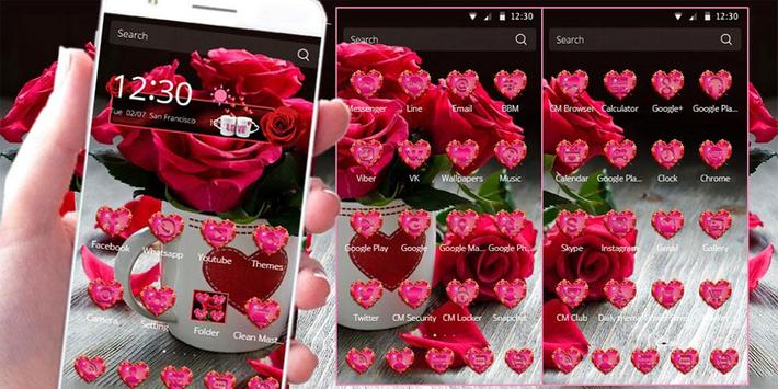 This red rose theme in mug cup has hd red rose live wallpaper with red roses on date wood table background. Red rose theme is romantic rose style with red rose flower or pink rose flower. Red rose theme has red roses in white coffee mug cup . It is mug cup with red heart markon it. It has love heart icon pack . Red rose circle with pink icons for popular apps.