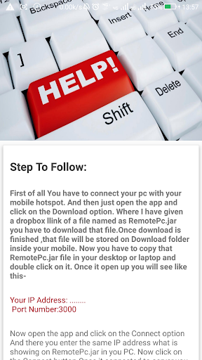 Now open the app and click on the Connect option And there you have to enter the same IP address what is showing on RemotePc.jar in you PC.