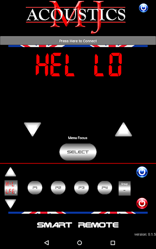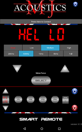 MJ Acoustics Smart Remote (SR) tablet veya akıllı telefon için bir uygulama. SR, SR Etkin donanımına sahip olan MJ akustik aralığındaki bu subwooferlarla kullanım için kablosuz iletişim teknolojisini kullanır. Yönlendirici bağlantısı için gereklilik yok, ancak Subwoofer ile akıllı cihaz arasındaki toplam özerk iletişim ile Bluetooth 4.x veri iletim protokolü kullanılarak elde edilir. Uygulama şu anda Android için mevcuttur, iOS versiyonu geliştirilmektedir. Tüm uygulama fonksiyonları ve menü içeriği, hem Android hem de iOS işletim sistemleri için de aynı olacaktır.