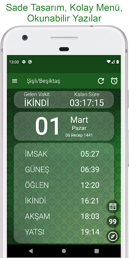 Ezan vakitlerini gösterir, kuracağınız alarm ile vakit öncesi sizi uyarır. Konumunuza göre kıbleyi, size en yakın camileri gösterir. Dini günleri, mübarek Ramazan ayında iftar ve sahur vakitlerini gösterir.