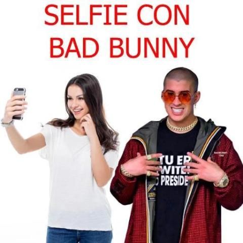 Tomate una selfie o selecciona la foto que tengas en tu galeria, selecciona una foto de Bad Bunny y genera la mejor selfie con Bad Bunny. Disfruta de las mejores fotos de Bad Bunny contigo! . Selfie con famosos, quote maker and editor, quote maker with photo.