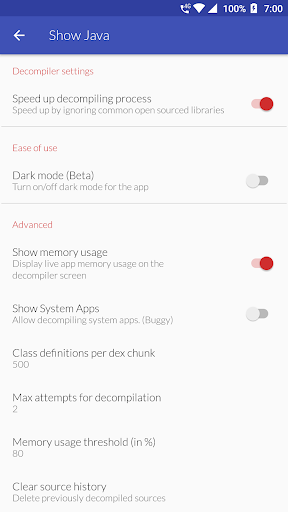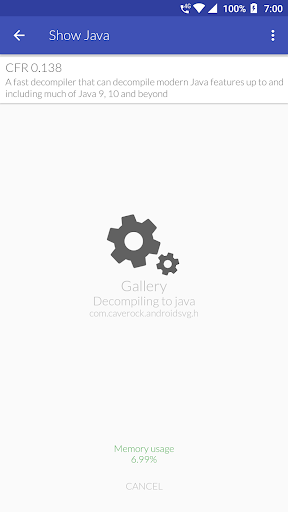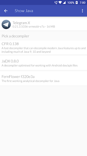 • CFR 0.138, JaDX 0.8.0 veya FernFlower (analitik kod çözücü ) derleyici olarak kullanmak için.
