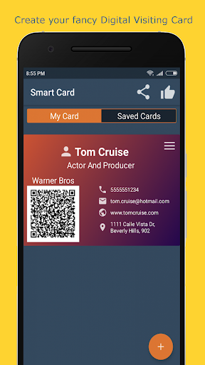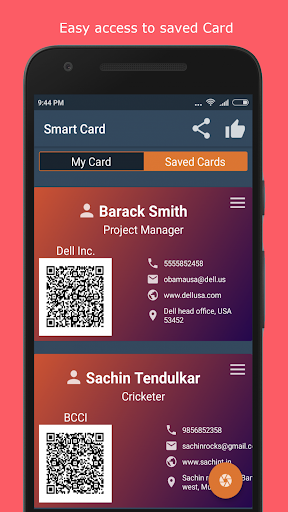 "Smart Card - Digital Visiting Card with QR Code" is a digital way of keeping your visiting card and share with friends, clients, partners and others. It generates the QR code which helps easy sharing. It's very simple and takes only a minute to generate your cool and fancy visiting card which will be instantly ready to share with anyone digitally. It allows to call, send email, visit website etc. directly from the Visiting Card and you can save the contact to your device if you wish to for other uses if you wish.