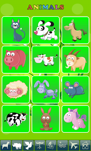 Each page has various item displayed with bright, cute cartoon items. Tap a picture and a real life photo of the items pops open, accompanied by the sound it makes. Tap the picture anywhere, and it disappears.