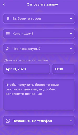 Free System for quick and easy retrieval of various services for the event. A distinctive feature of the application is that the customer service itself has a cost and has a direct access to the performer without any intermediaries in the face event managers and event agencies. That driver includes all kinds of search services and the rental of necessary equipment for the event.