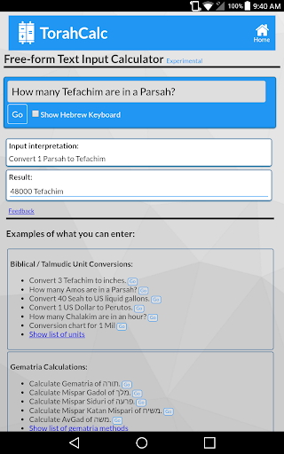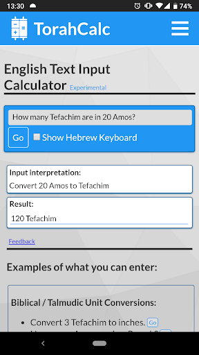 - You can currently type in requests for Biblical / Talmudic unit conversions, gematriah calculations, Hebrew calendar conversions, Molad calculations, or leap year calculations. More calculations coming soon.