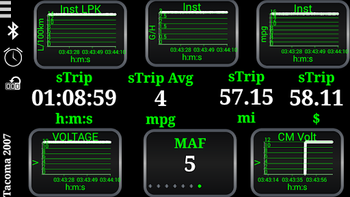 It can display an assortment of mileage gauges including Instantaneous MPG, Average MPG, Trip gauges, gallons per hour, and more. UltraGauge Blue can scan and read vehicle Trouble Codes and can even display potential Trouble Codes and Clear the Check Engine Light (CEL). Blue provides customizable alarms for every gauge. UltraGauge Blue can be paired with most Android and Apple mobile devices.
