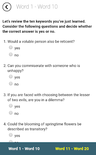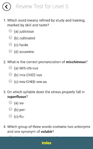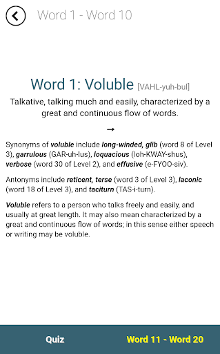 Siz her seviye bir öncekinden daha zorlu olan on seviye kelime dağarcığından geçecek. Örneğin, Seviye 1, yetişkinlerin yaklaşık yüzde 60 ila 70'ine aşina olan, yani birçok lise mezunu ve çoğu üniversite mezunu tarafından bilinen kelimeler içerir. Seviye 5'in sonunda, kelime dağarcığınızı yaklaşık 75. yüzdelik dilime - tüm eğitimli yetişkinlerin en üst çeyreğine - yükseltmiş olacaksınız. Seviye 8'in sonunda, kelime bilginiz, ileri derecelere sahip olanlar da dahil olmak üzere çoğu yönetici ve profesyonelin kelime dağarcığını aşmış olacaktır. Ve onuncu ve son seviyeyi tamamladığınızda, tüm nüfusun yüzde 95'ini aşmış olacaksınız. Her bin kişiden yalnızca bir avuç insanın eşleşebileceği bir kelime cephaneliğine komuta edeceksiniz.