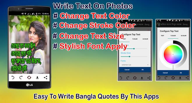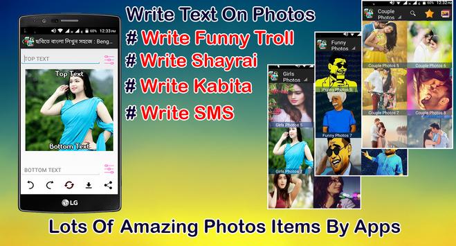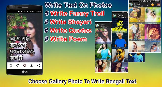 আপনার ছবিতে বাংলা কবিতা, বাংলা গজল, বঙ্গীয় ধ্যান, বঙ্গীয় আলাপ, আপনার ছবিতে এস এম এস , শায়রী, ফানি ট্রল বাংলা অ্যাপ্লিকেশন ব্যবহার করে খুব সহজেই তৈরি করতে পারবেন।