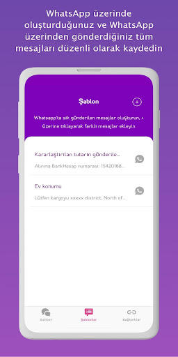 • WhatsApp'ta sık kullandığınız mesajları şablon olarak kaydedin. WhatsApp'ta istediğiniz zaman tek tıkla paylaşmak üzere WtsAppy'de not olarak kaydedin. Evet, sadece TEK TIKLA! Posta adresinizi, konumunuzu veya banka hesabınızı şablon olarak kaydedebilirsiniz.