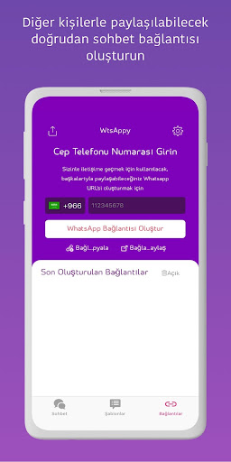 • WtsAppy ile kendi WhatsApp bağlantınızı oluşturun veWhatsApp üzerinden size ulaşmak isteyen kişilerle paylaşın; numaranızı paylaşmak ve kişiler arasına kaydetmek yerine sadece tek tıkla ulaşılabileceksiniz. WhatsApp bağlantısı artık herkese lazım, özellikle de işletmeniz varsa; artık WtsAppy ile sadece 10 saniyede edinebilirsiniz!