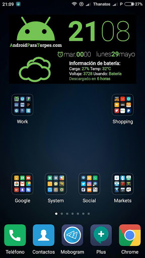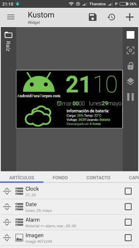 Widget personalizado de AndroidParaTorpes.com para la aplicación KWGT. Con información del tiempo del mismo día, hora, próxima alarma, fecha con día y mes, y toda la información detallada de la batería y su uso.