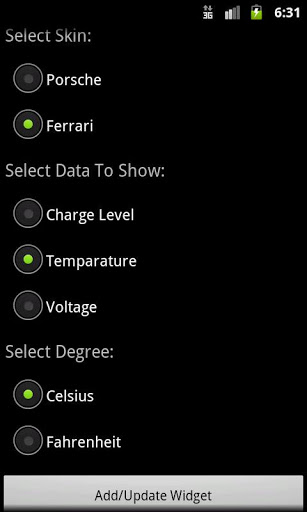 Its a tiny Battery Dashboard Widget that looks like a sports car gauge. You can show charge level, voltage and temperature using this widget. Add multiple widgets to show all battery info.Porsche, ferrari and Lamborghini skins included.To add widget press: Homegt;Menugt;Addgt;Widgetsgt;Battery Dash.Please feel free to leave a feedback, request changes etc.Click on widget to change settings.