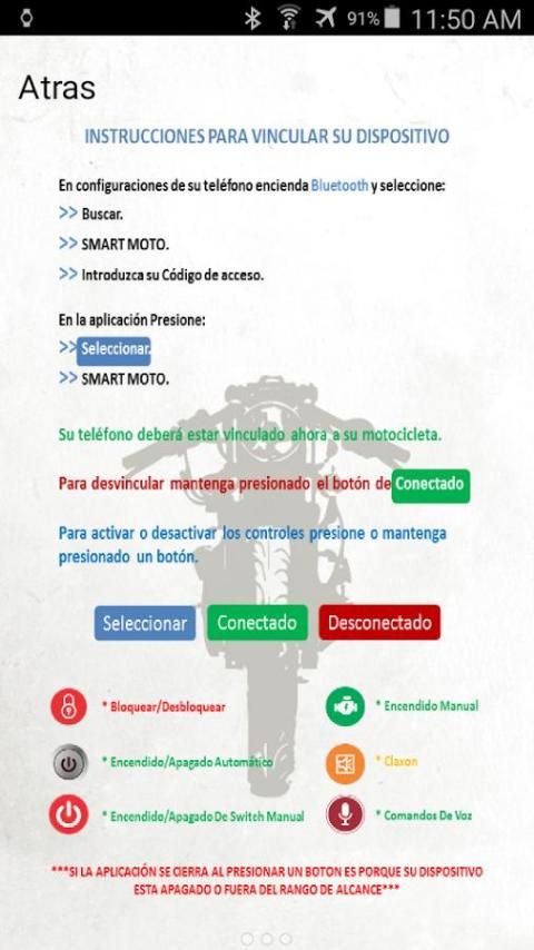 * Regresar a tu motocicleta, abres la aplicación y con solo presionar un botón haces que tu moto se desbloquee y encienda todo en un solo click.