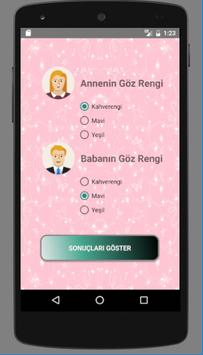 Eşinizin ve sizin göz renginizi seçerek bebeğinizin olası göz rengi ihtimallerini karşınıza sunar. Sizin bu uygulamada tek yapmanız gereken kendi göz renginiz ve sevgilinizin göz rengini listeden seçmeniz. Uygulama size bu bilgiler doğrultusunda doğacak çocuğunuzun göz rengi hakkında ihtimaller verir. Uygulama bebeğin göz rengi yüzdelerini bilimsel olarak kahverengi, yeşil veya mavi arasında sonuçlandırır. Yalnız bu bilgilerin sadece birer ihtimal olduğunu unutmayalım. Uygulamayı daha iyi hale getirebilmemiz için fikirlerinizi yorum atarak belirtmeniz sizlere daha iyi sonuçlar sunmamız için bize yardımcı olacaktır. Bebeğiniz gözleri gibi güzel bir yaşama sahip olması dileğiyle...