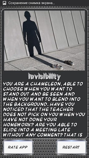 In this quiz you will find out what your hidden superpower is! It could be super human strenth to the pwer of telekenesis. Just fill out these 15 Questions, and it will tell you what superpower is in you, so find out now! Begin your quizzes.... now!
