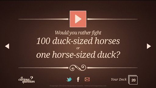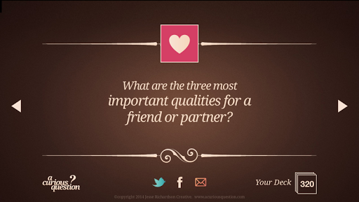 Introducing A Curious Question - it’s an app that kick-starts a conversation to an immediately curious place. There’s more than 300 genuinely interesting questions, all designed to make people do that sideways things with their head, where they furrow their brow in contemplation and go ‘hmmm’.