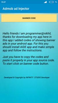In this application codes are available to add admob banner ads. The user should have AIDE app. AIDE app is like android Studio for Android phone. The user can make app in AIDE and add ads with the help of this application.
