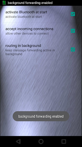 Use the menu (Settings->Communication option "routing in background") to enable this app running in background if you still want to receive or forward messages from your friends after closing this app.