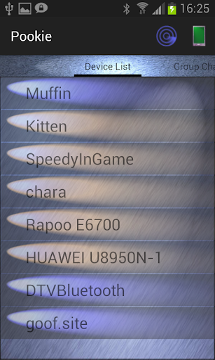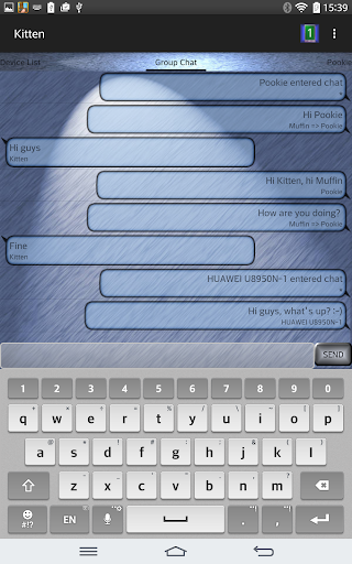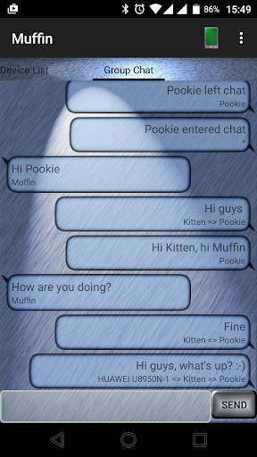 Create your own network by connecting as many devices as you want (up to seven connections per device). To connect to a certain device tap on it in the device list. If the desired device runs this app as well then the group chat screen will open up.