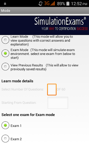 Complete explanation is provided for each question in Learn mode, and actual exam environment is simulated in Exam mode. Options to save the results and reviewing questions are provided.