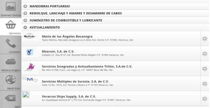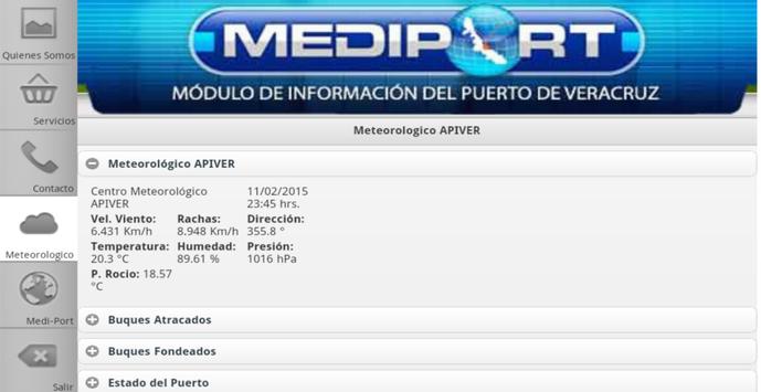 Application to display information related to the Port Authority of Veracruz (Veracruz API) Contained in this application? - About us - Services - Contact - Weather - Ships Docked - Ships anchored - Port State - Link to Medi-Port Web