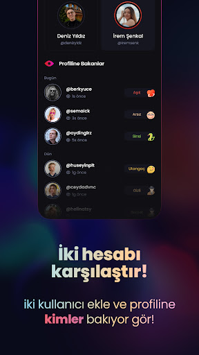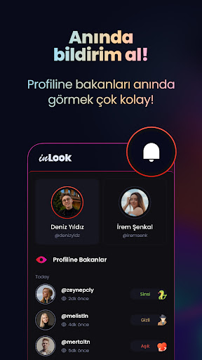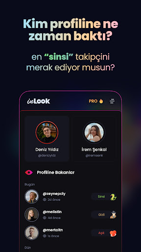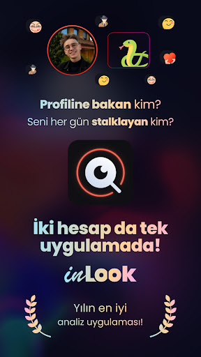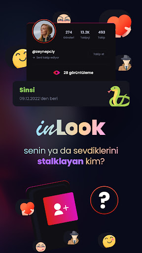 inLook ile takipçilerini analiz edip 10 farklı takipçi modelini görüntüleyebilirsin. Arkadaşının veya sevgilinin en yakın arkadaşı kim, kim sinsi bir şekilde onları takip ediyor? Hatta iki profilide tek bir uygulamada analiz edebilirsin.