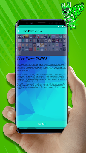 The morph mod makes you as a player turn into any monster after killing it. You can change all the morphs you have and of course at any time. interesting right? It's an included disguise where it can also be a fun adventure in MCPE and visa being a top favourite. It's also compatible with whatever mod you do, you can also animate creatures, so you have to use special powers if you add a piece of ore, it will work on the boss itself. The way you turn into a monster is very unique and scary that you can use. it takes each model piece from the monster and hides it and resembles it to the player.