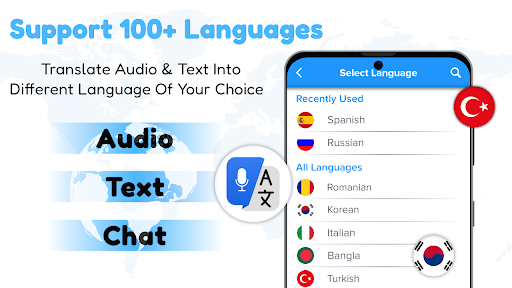 Ancak hepsi bu kadar değil – Voice, Chat, Audio Translator uygulaması, sesli notları ve sesli mesajları çevirmenize olanak tanıyan bir sohbet çevirisi özelliğine de sahiptir. Bu, mesajlaşma veya e-posta gibi metin tabanlı iletişimi tercih eden kişilerle iletişim kurmak için mükemmeldir. Bu özellik sayesinde, hangi dili konuşurlarsa konuşsunlar, dünyanın her yerinden insanlarla kolayca iletişim kurabilirsiniz.