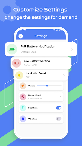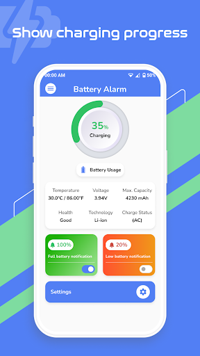 - Set personalized alarm notifications for when your battery reaches a specific percentage