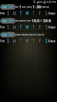 Application save battery by letting user control opening mobile data in three different options. option 1: by opening mobile data for a short period in each repetitive cycle "for example a minute every hour", option 2: by opening mobile data for a period in selected days "for example from 10:00 am to 2:00 pm in SU, TU, WE", option 3 for whole selected day "for example FR, SA, SU".